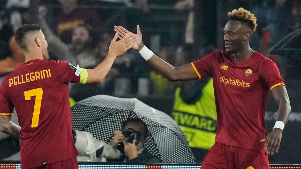 Roma’s Tammy Abraham and Lorenzo Pellegrini celebrate their win